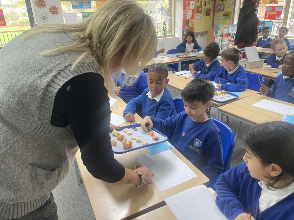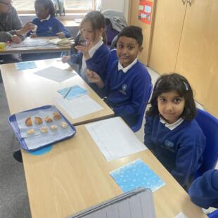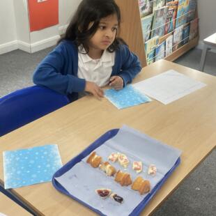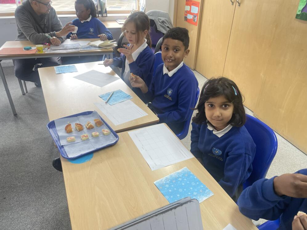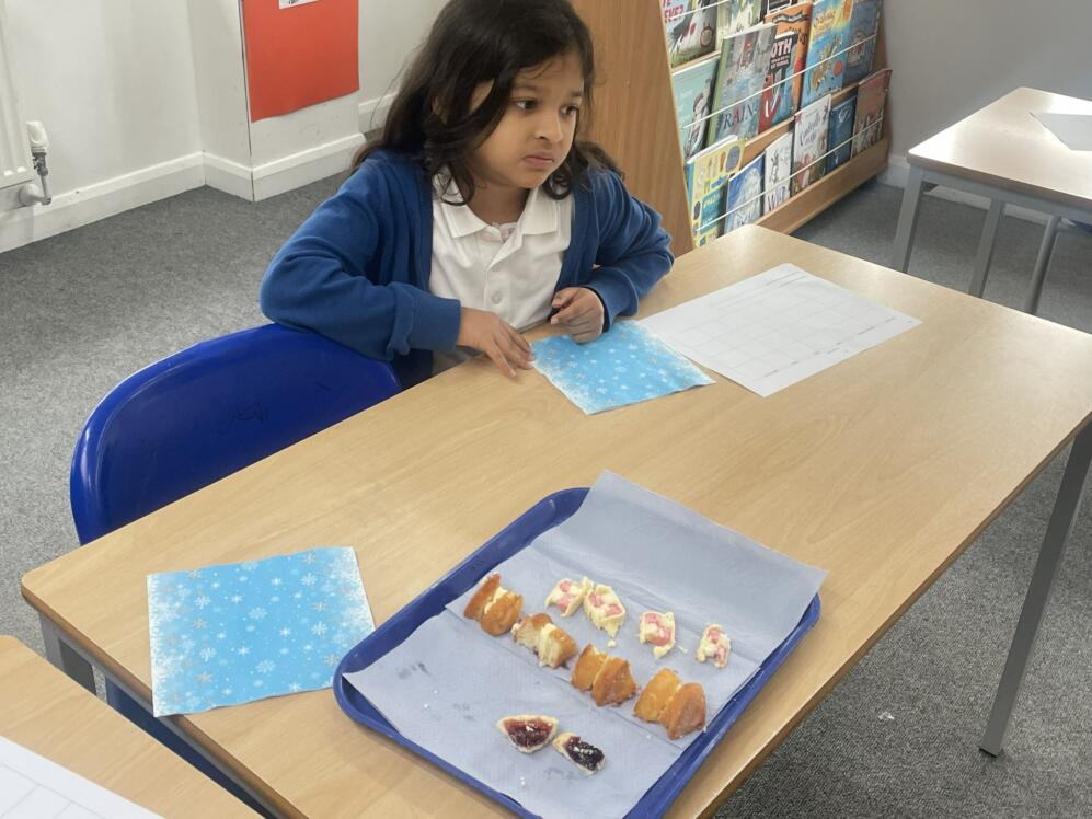 We tasted Victorian sponges, Battenberg cake and jam tarts and thought about the taste, appearance and texture before giving them marks out of ten. We learnt that the Battenberg cake was created for the 1884 wedding of Princess Victoria and Prince Louis of Battenberg (from Germany). Some believe the four squares of the cake represented the four Battenberg brothers.