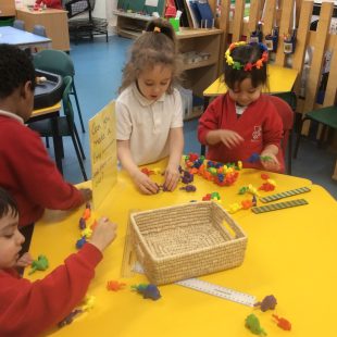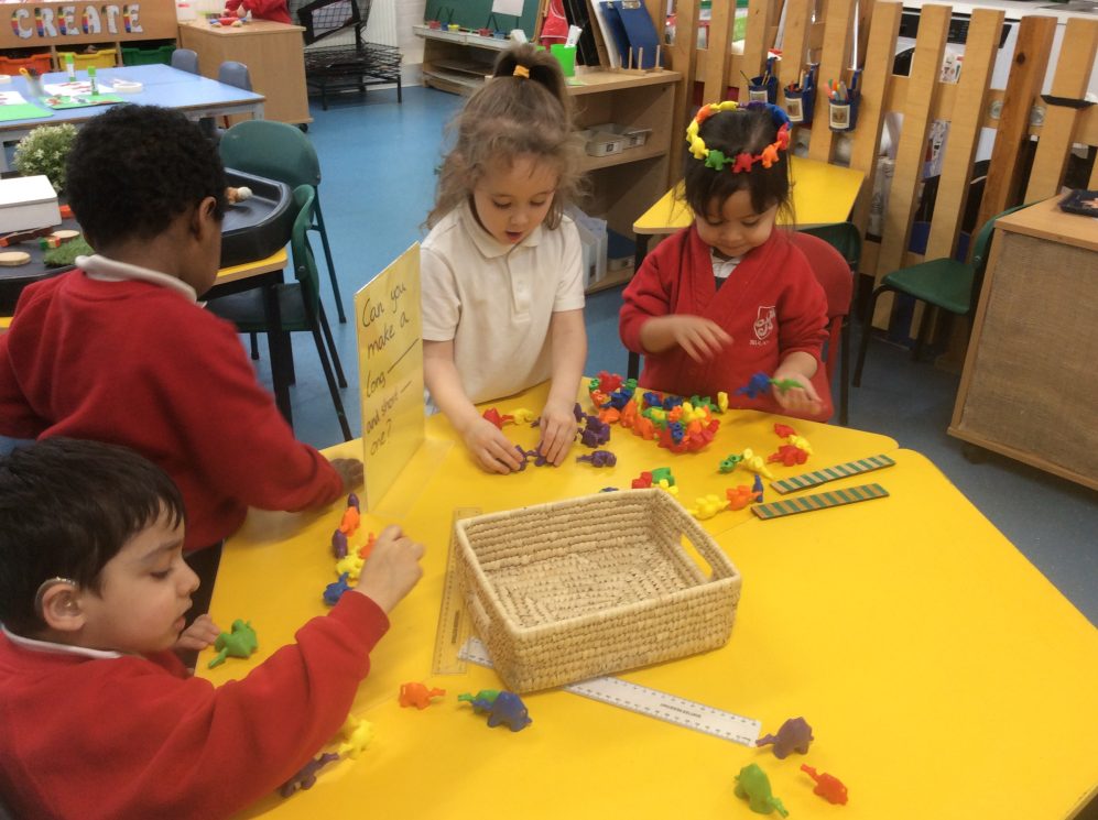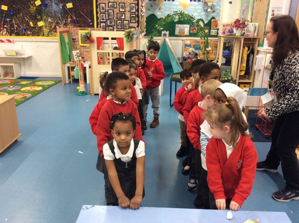 In Maths, we have been learning about comparing lengths and positional language. The children enjoyed using positional language when we followed the gingerbread route to describe where the animals in the story were hiding in our garden. After reading The Enormous Turnip we made two lines to pull out the ‘turnips’ and children noticed one line was longer!