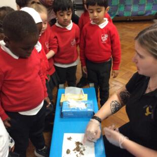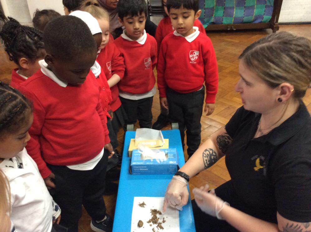 We also learned that birds don’t chew their food and can take many hours — sometimes even two days — to digest it! Whatever they can’t digest is brought up in a mass of material called a pellet. We had a look at a pellet that Bella expelled the day before — we could even see a mouse’s bones!