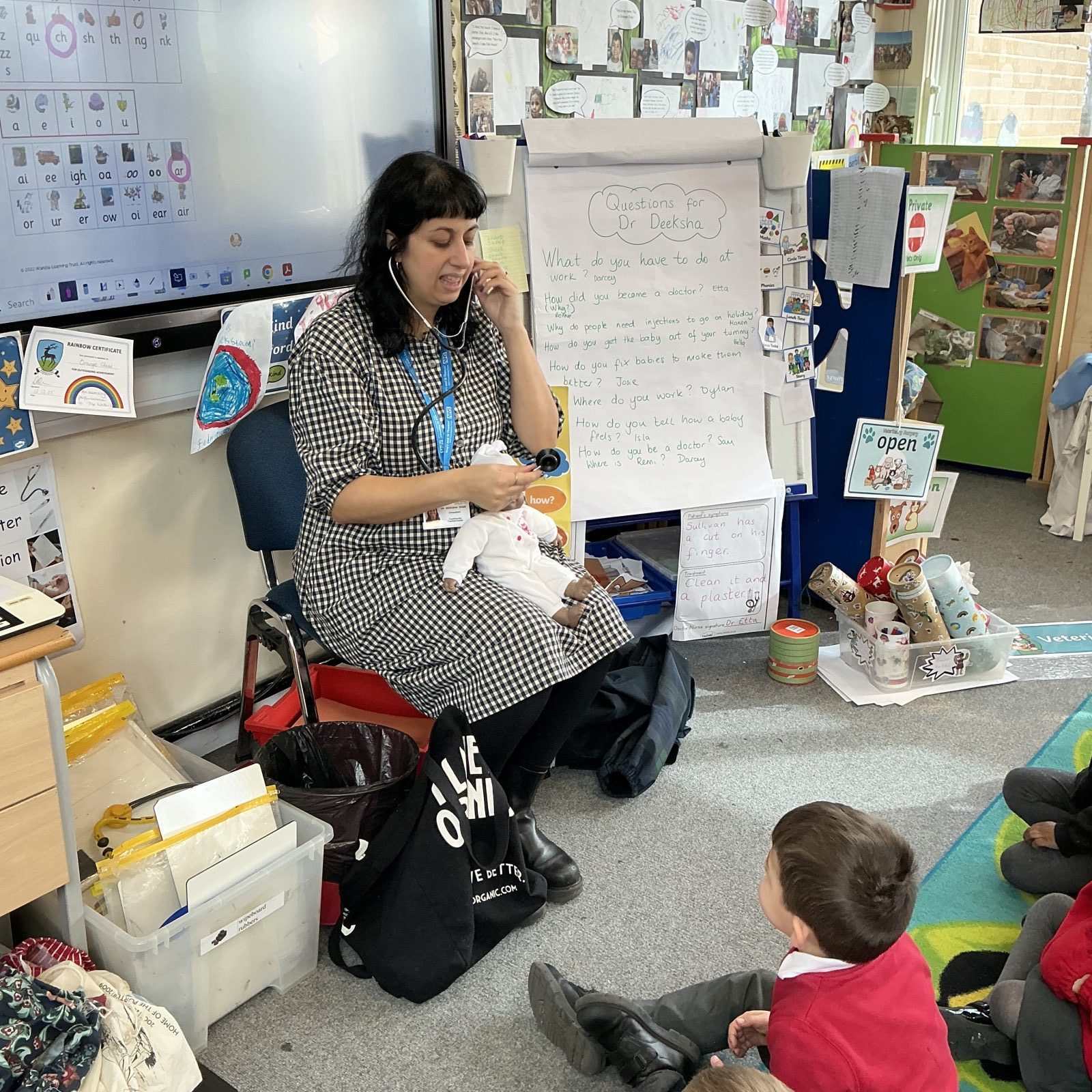 Then Dr Deeksha, a hospital paediatrician, who also happens to be Remi’s Mum, popped in to teach us all about how she looks after babies when they are in hospital. We shared our experiences of looking after babies and being in hospital. There were some very interesting questions about how and why Dr Deeksha can’t deliver her own baby when it is due!