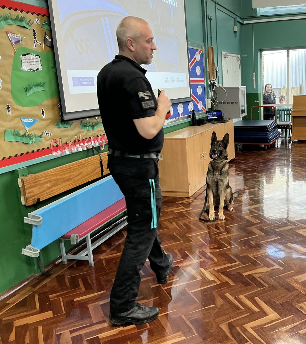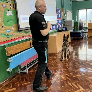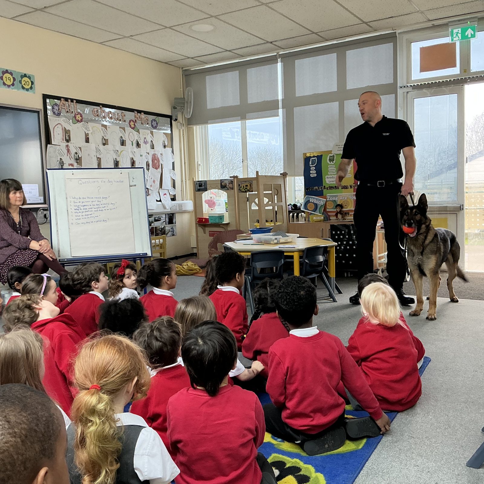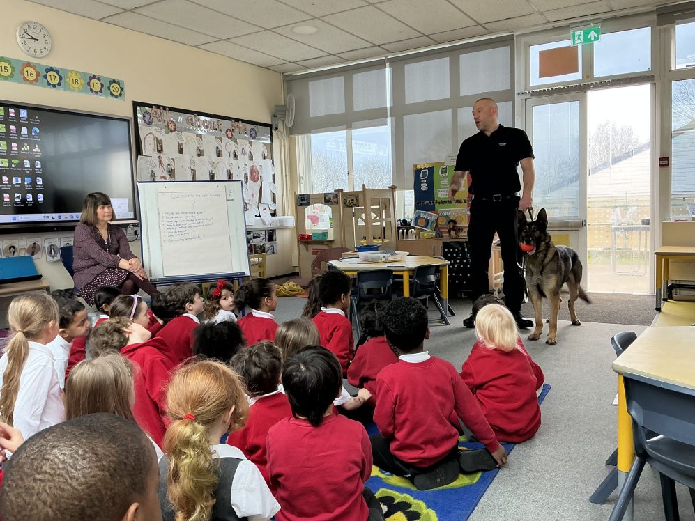 Our topic was kick started with a visit from Jon, who is a police dog handler, and his dog Rumour. He gave an assembly to the whole school and then spent time in each of the Reception classes. Rumour, his German Shepherd dog was incredibly well trained and well behaved. We heard how Rumour barks on command and when he has found a missing person. It was SO loud!