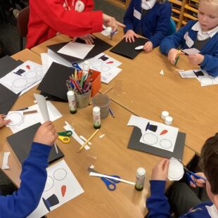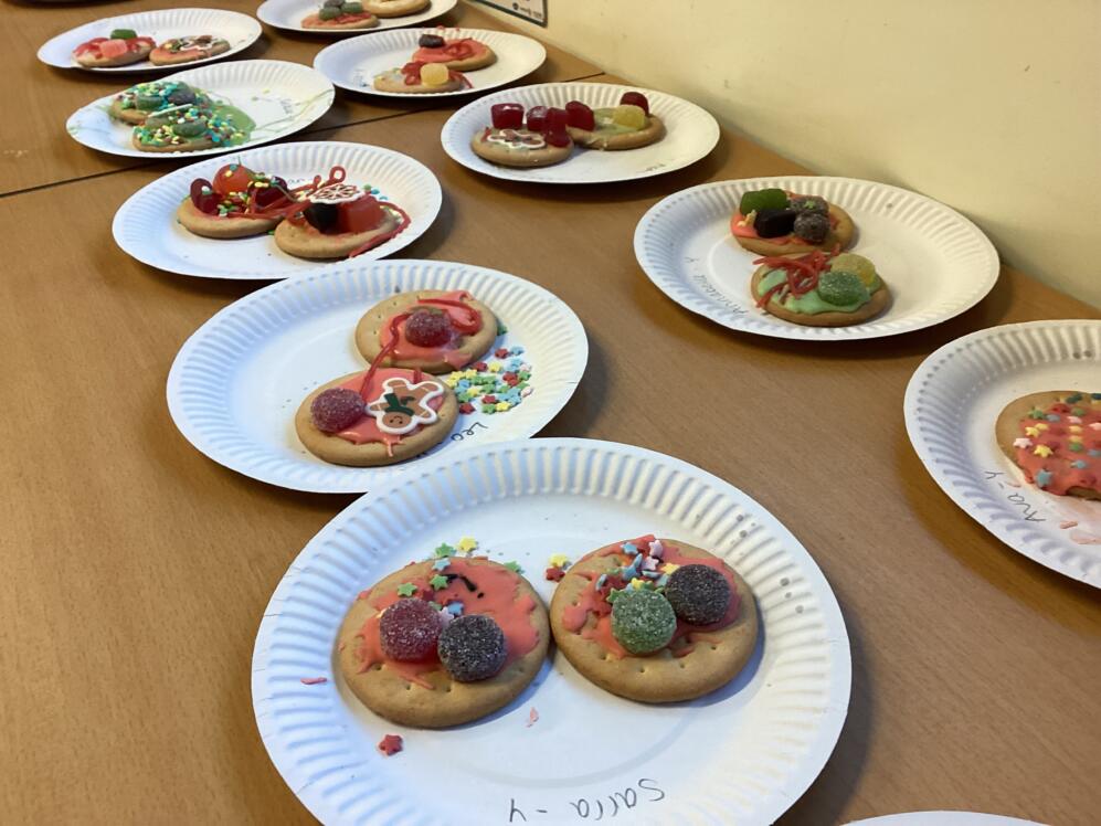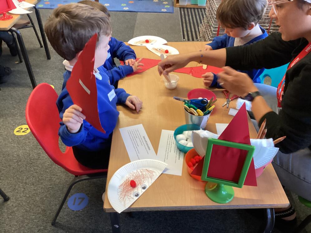 In Nursery, Christmas biscuits were being decorated as well as wooden baubles. In Red class, reindeer crafts were assembled and trees were being decorated. In Yellow class, Father Christmas was constructed and snowman Christmas cards were being made.
