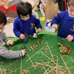 Over the last two weeks, we have been reading the traditional story of The Three Little Pigs. The children have loved reading this story and bringing the language alive. In our literacy focussed sessions, we have acted out the story using actions, puppets, masks and a mini stage. The children have also used pictures to sequence the story and retell it in their own words. We have been busy working collaboratively to make our own little pig scene for museum day! We also had a mini experiment. In this experiment, we tested the strength of different materials. Using a hairdryer, sticks, straw/hay and bricks we watched what happened to the different materials when there is a big ‘gust of wind’. The children made predictions about which material they thought would be the strongest and when the experiment was finished, they were encouraged to pick one of the materials to use to build their own house. The bricks were a clear winner!