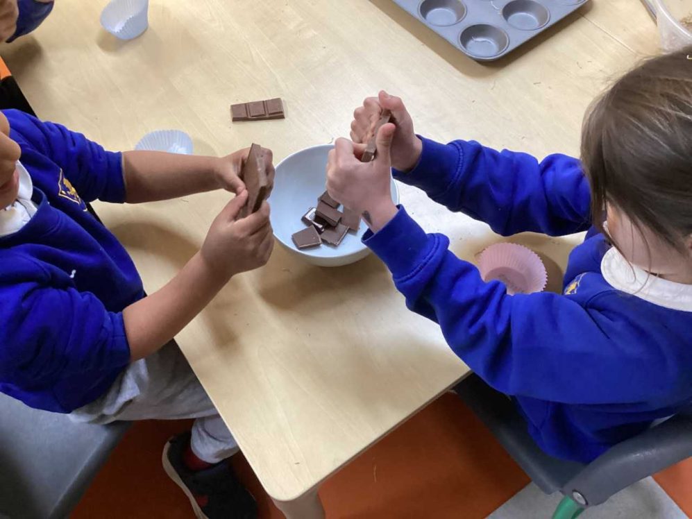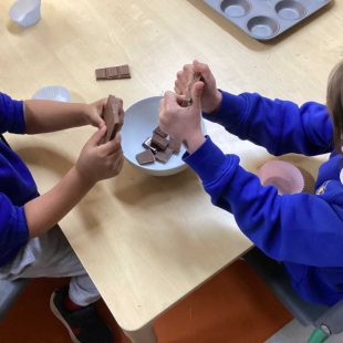 As a special Easter treat, we made chocolate nests. We crushed the cereal, melted the chocolate in the microwave and then mixed it all together. To complete the nest we added mini chocolate eggs on top. Then we let it set in the fridge before we could take them home to eat!!