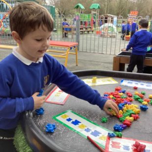 In maths, we have been learning about repeated patterns. We have made repeating patterns with natural objects, actions and colours.