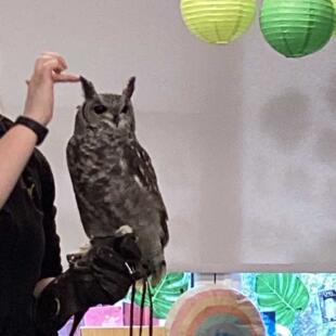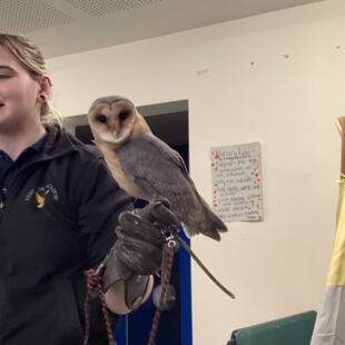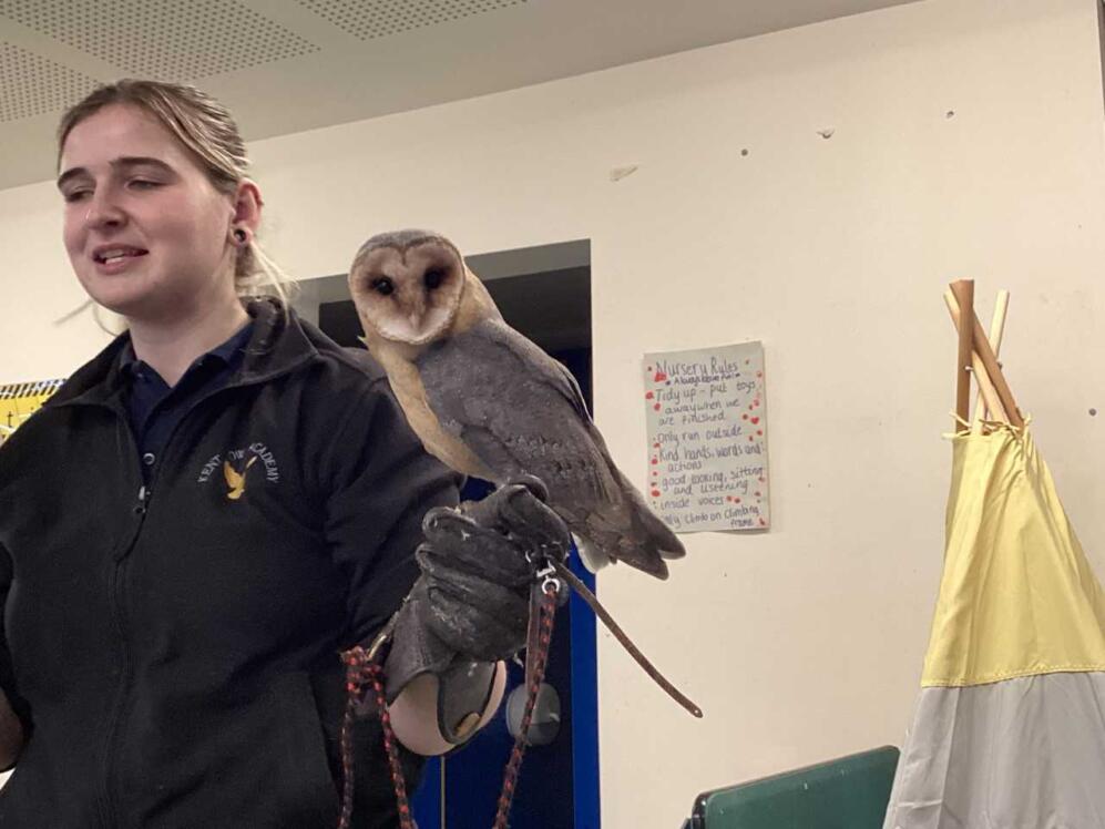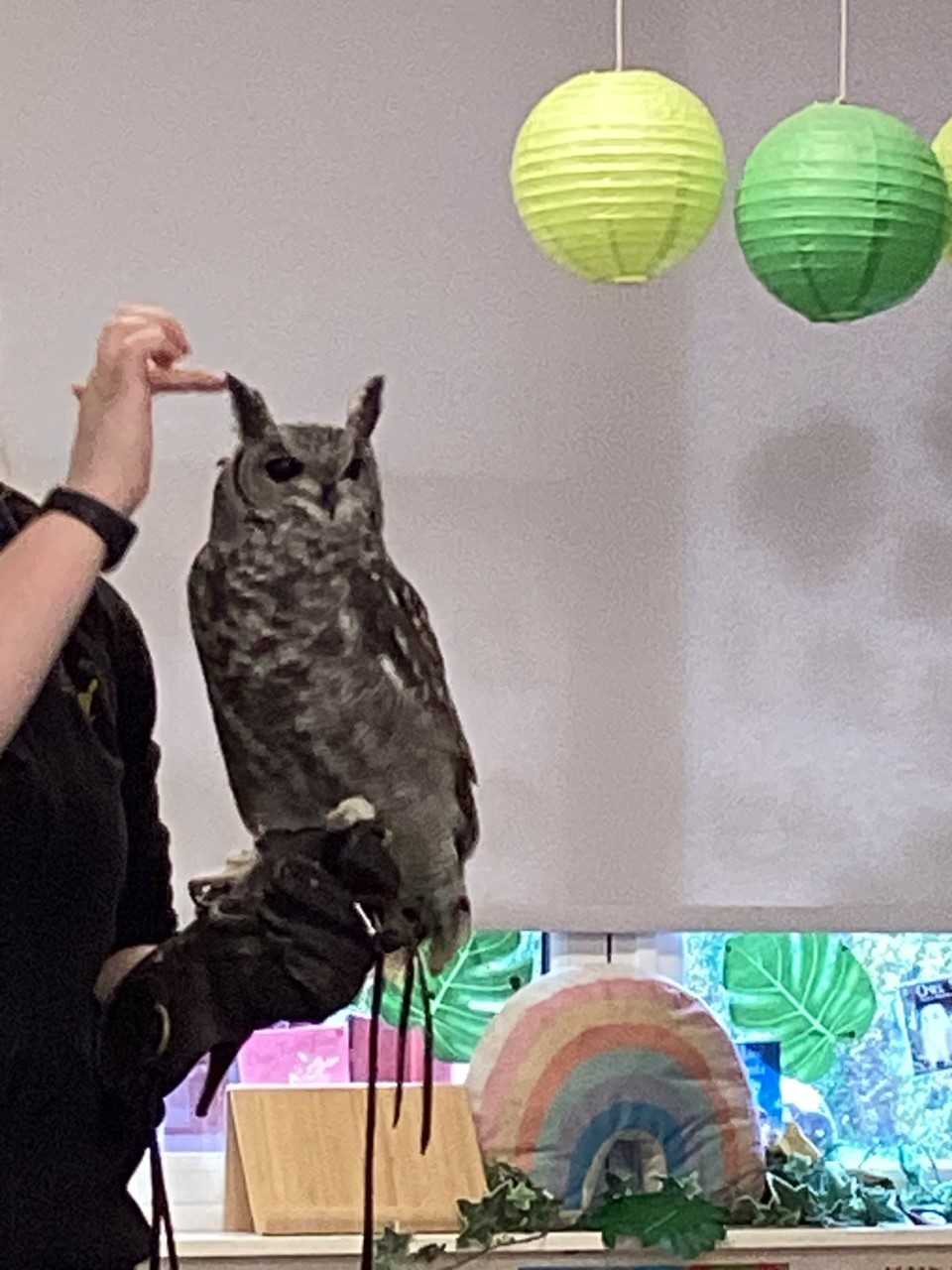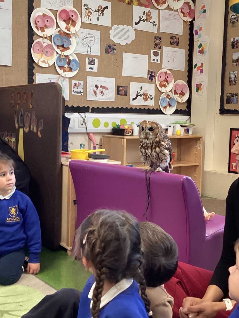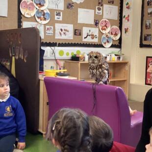 In follow up from reading the story ‘owl babies’ last term, we had a visit from the Kent owl academy. We met 3 owls; Harvest – the dark breasted barn owl, Severus – the vermiculated eagle owl and Percy – the tawny owl, as well as their handler Charlie. Charlie told us lots of interesting facts about each owl. We learnt that they have fantastic hearing and sight but not a very good sense of smell. We also learnt that they eat mice (and other animals) whole and regurgitate bits that cannot be digested into a pellet. We even got to break up some pellets to have a closer look.. we found bones, fur and a tail!!!! The children also looked at and listened to the difference between owl and eagle feathers.  They were amazed at how silently an owl can fly. At the end of the session, Percy flew around the room and over the children’s heads. So exciting!
