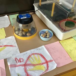 And finally, in our learning all about lifecycles, a batch of 19 eggs arrived on Monday. As we ‘did not know’ what was in the eggs, we researched what animals are born from eggs and then estimated what animals we thought were inside them. The children have been very good at creating signs to tell people not to touch the eggs as they need to stay safe and warm while they hatch. On Thursday, the first egg hatched, and out popped a partridge! On Friday morning, five little birds were running around, with more on the way. Our thanks go to the FOAP who paid for this amazing experience for the children.