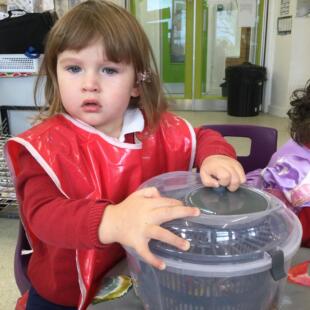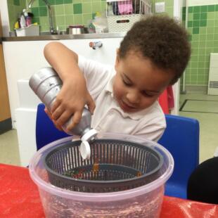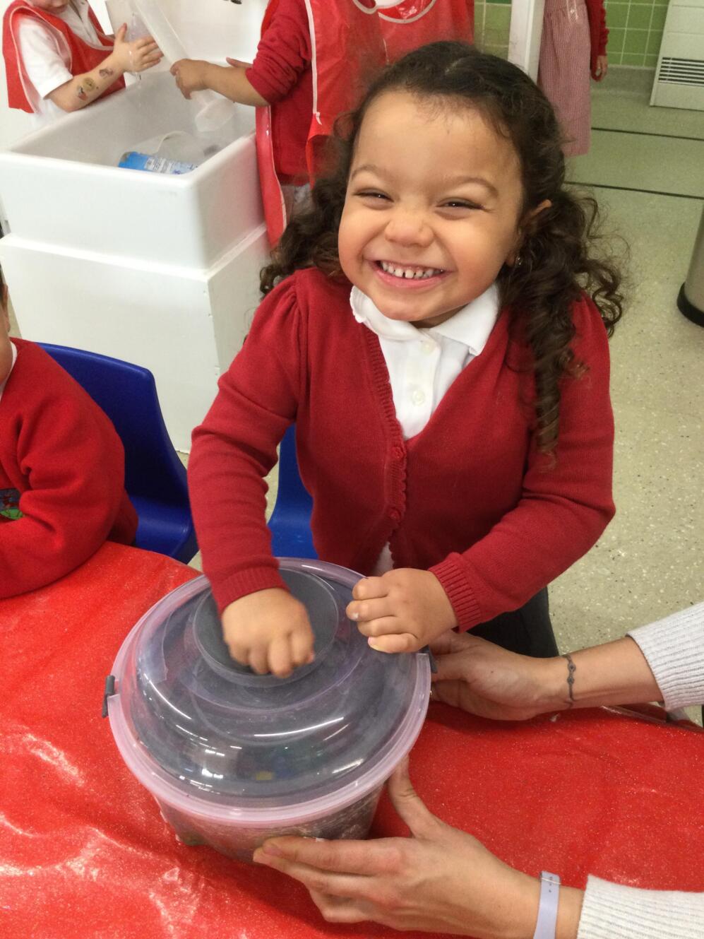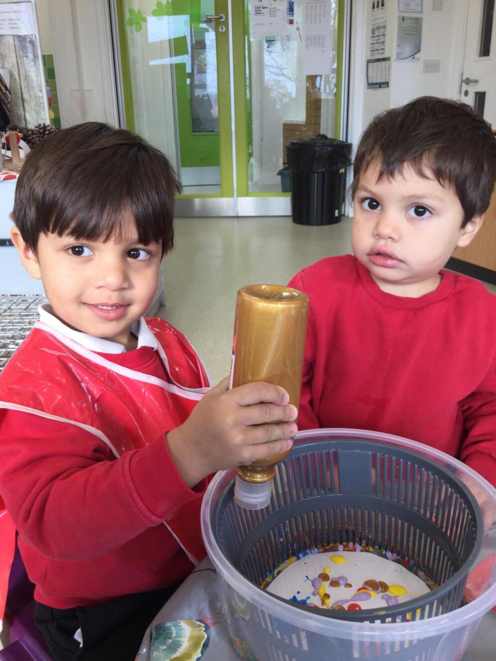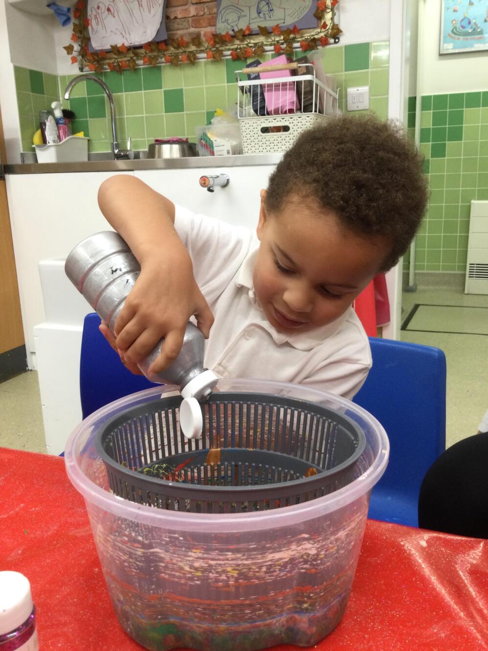 Many of the children have been telling us all about the fireworks they have seen over half-term and this week, for both Diwali (the Hindu Festival of Lights) and Bonfire Night (November 5th). We created our own firework pictures by squeezing different coloured paint on to circles of paper in a salad spinner. We then used our strength to move the handle of the spinner to spin the basket inside as fast as we could. This movement made the paint ‘explode’ like fireworks and the finished pictures looked fabulous, especially with the addition of some sparkly glitter!