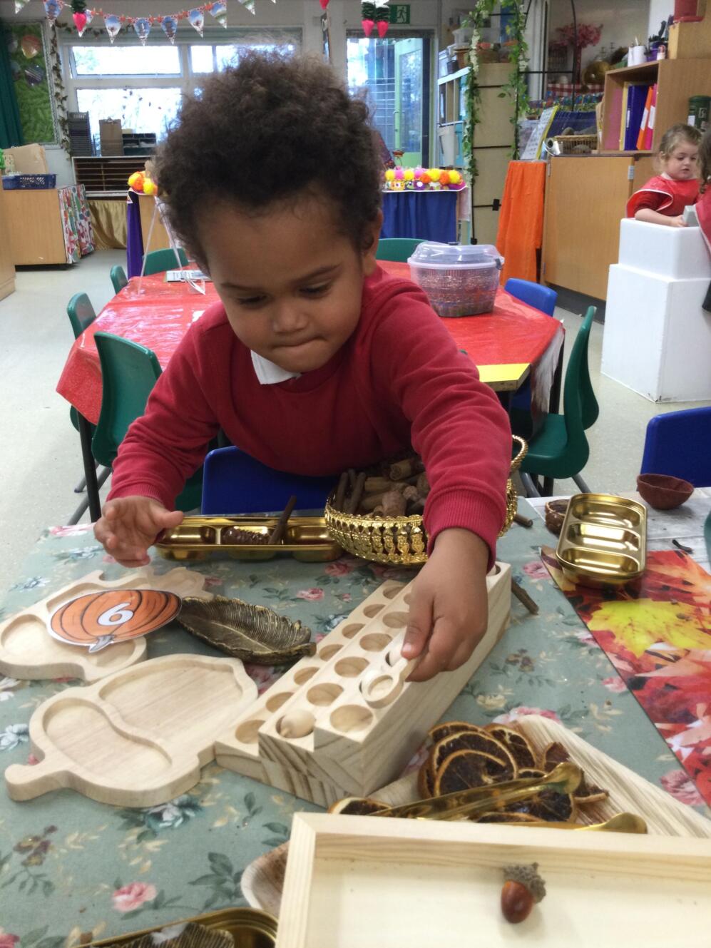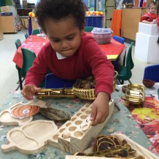 We have enjoyed exploring our classrooms, both inside and outside and have particularly loved playing with the Autumn-themed loose parts. It has been so interesting watching the children use these resources so purposefully, creating patterns and using their fine motor skills with such dexterity.