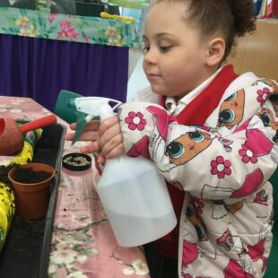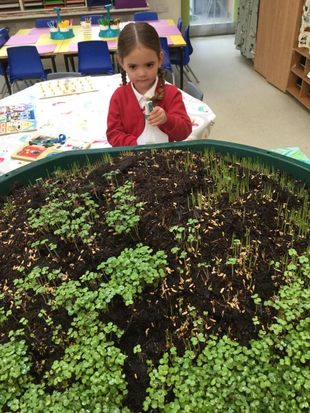 Alongside our story-telling this week, we have been doing lots of work around growing. We have planted Cress Mountains using compost, mustard and cress seeds and cat grass seeds. We have been very vigilant in making sure that we keep the compost watered and we have been taking turns in using the water spray. Some of us found it tricky at first to push the trigger, but we soon got the hang of it and are now all dab hands at caring for our plants! We have been amazed at how quickly the cress and cat grass have been growing in just a few days and it has caused great excitement and conversations around what is happening from day to day.