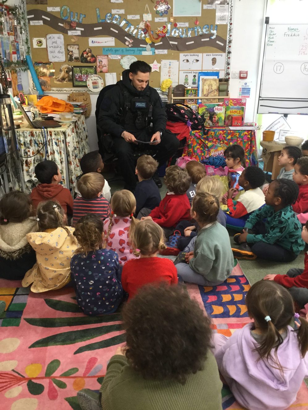 P.C.Nawol came to visit us on Monday and told us all about his job. One of the children in Nursery asked him such a clever question! She asked: “Did you arrest the King’s brother?” He didn’t but we were wowed with her linking her knowledge of the Royal Family to asking our visitor this!