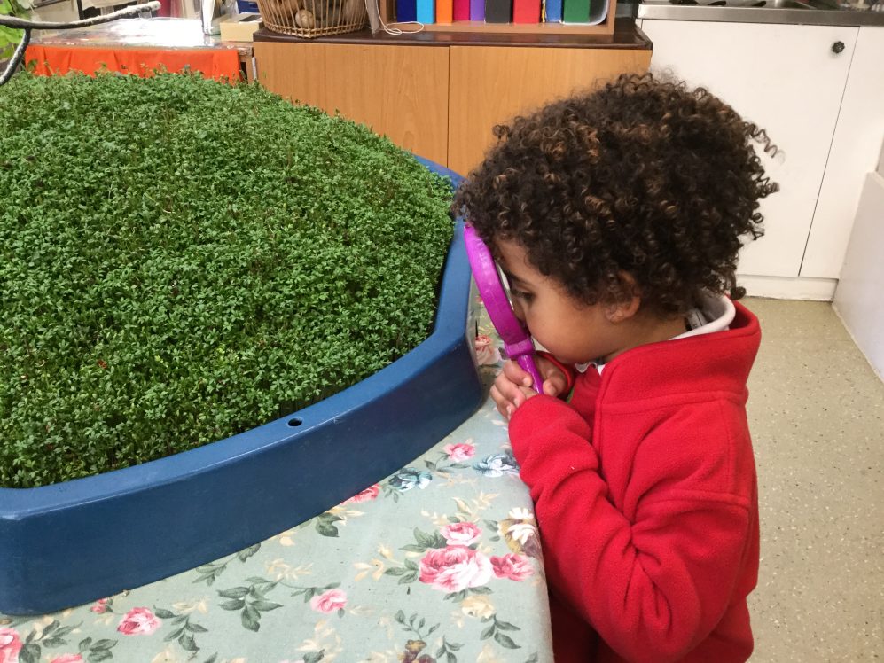The Rainbow and Nursery children have been taking really good care of our cress mountain, taking turns to water it with the spray bottles and making sure that the sun could get to it, in order for it to keep on growing.