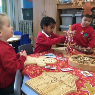 We have enjoyed using the gingerbread themed resources, such as mini gingerbread men of various sizes and candy canes, to create transient art on the gingerbread and sweet house boards. How creative we all are in making patterns!
