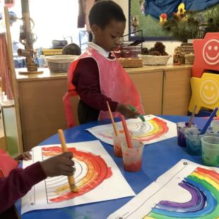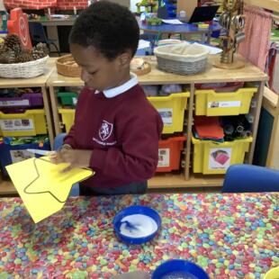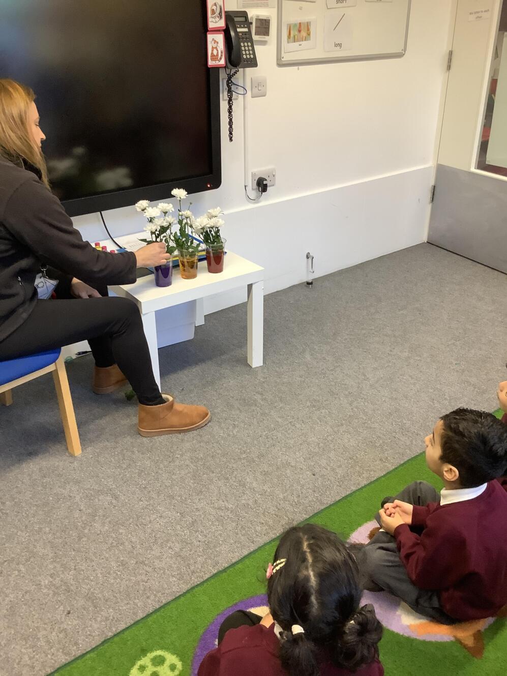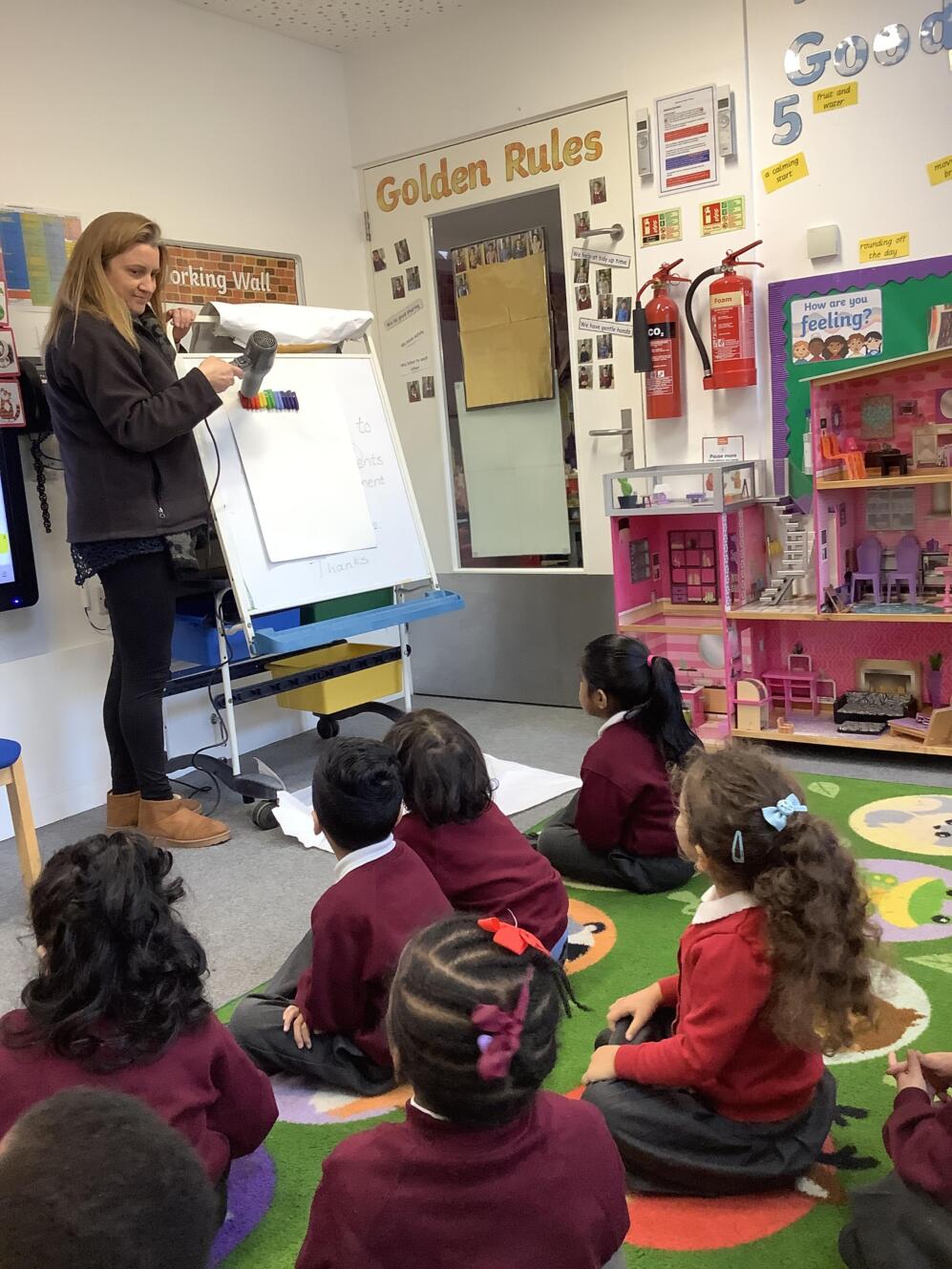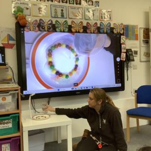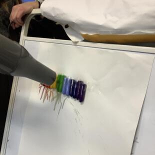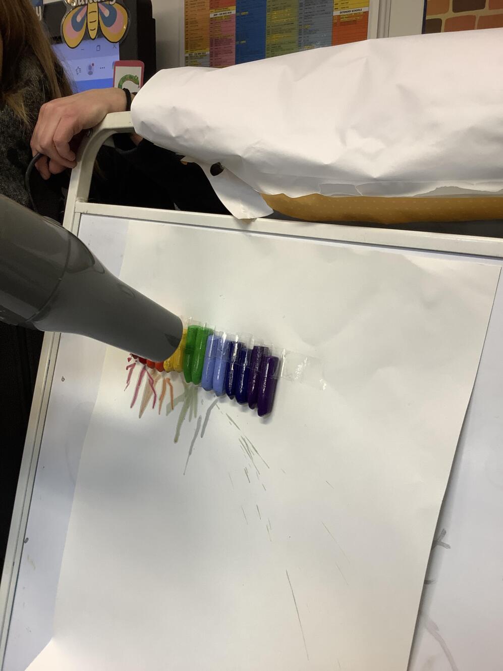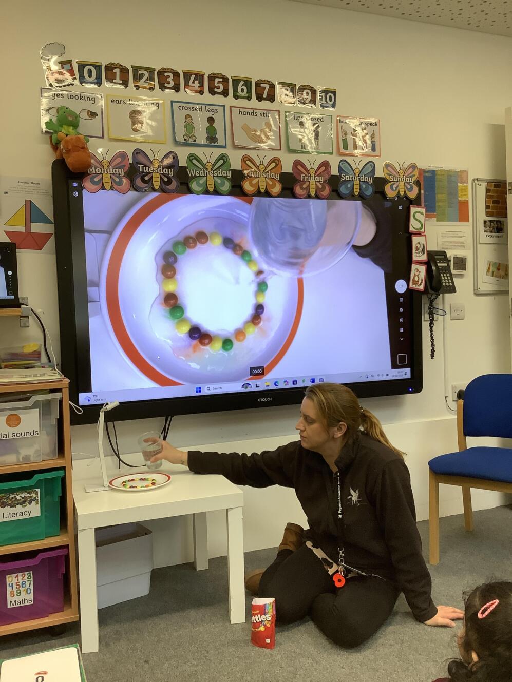 This week in Gold Class we have been extending on from our colour topic and have been doing lots of experiments with colours. We discussed what an experiment was and then made our own predictions of what we thought would happen with each one. On Tuesday we added flowers to coloured water to see what would happen. Some predictions the children had were that they would explode or grow bigger and bigger! After leaving them for a few days we realised that they changed colour! On Wednesday we stuck some wax crayons to a piece of paper and blew hot air on them using a hairdryer. The children used lots of lovely language such as melting and shiny to describe what they saw happening. On Thursday we added warm water to a circle of skittles arranged on a plate and watched as a rainbow appeared!