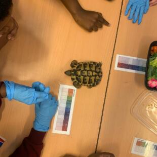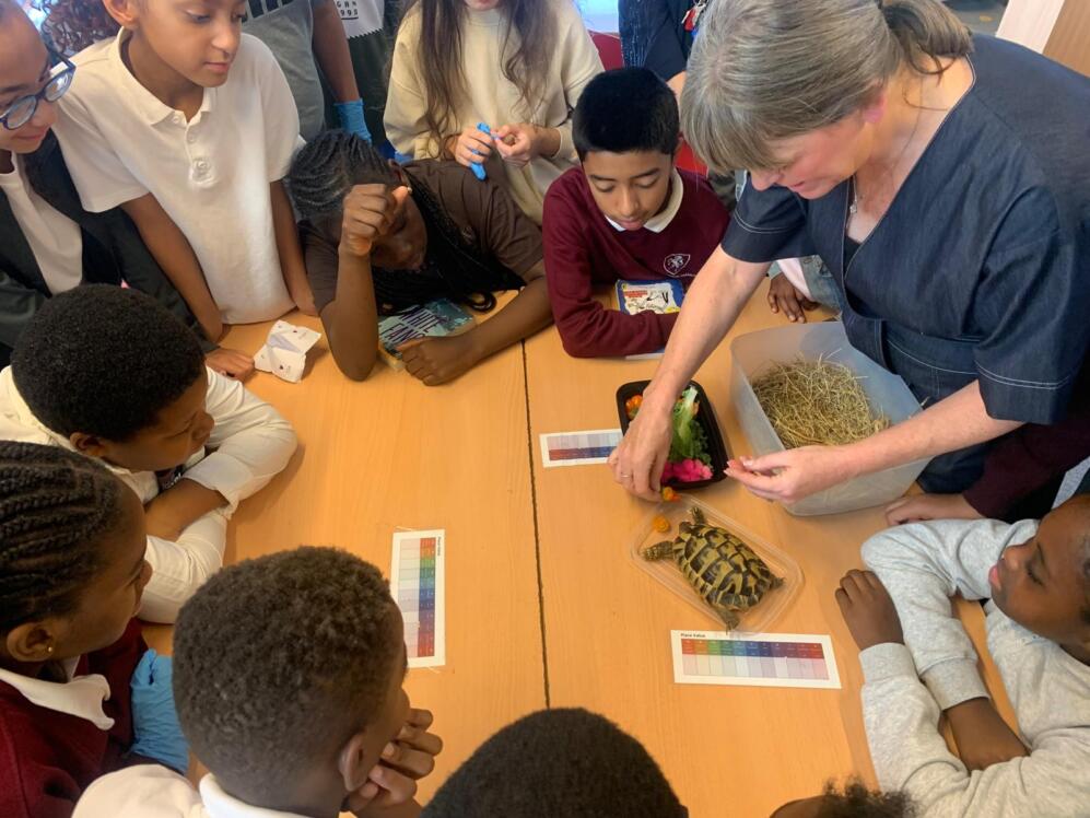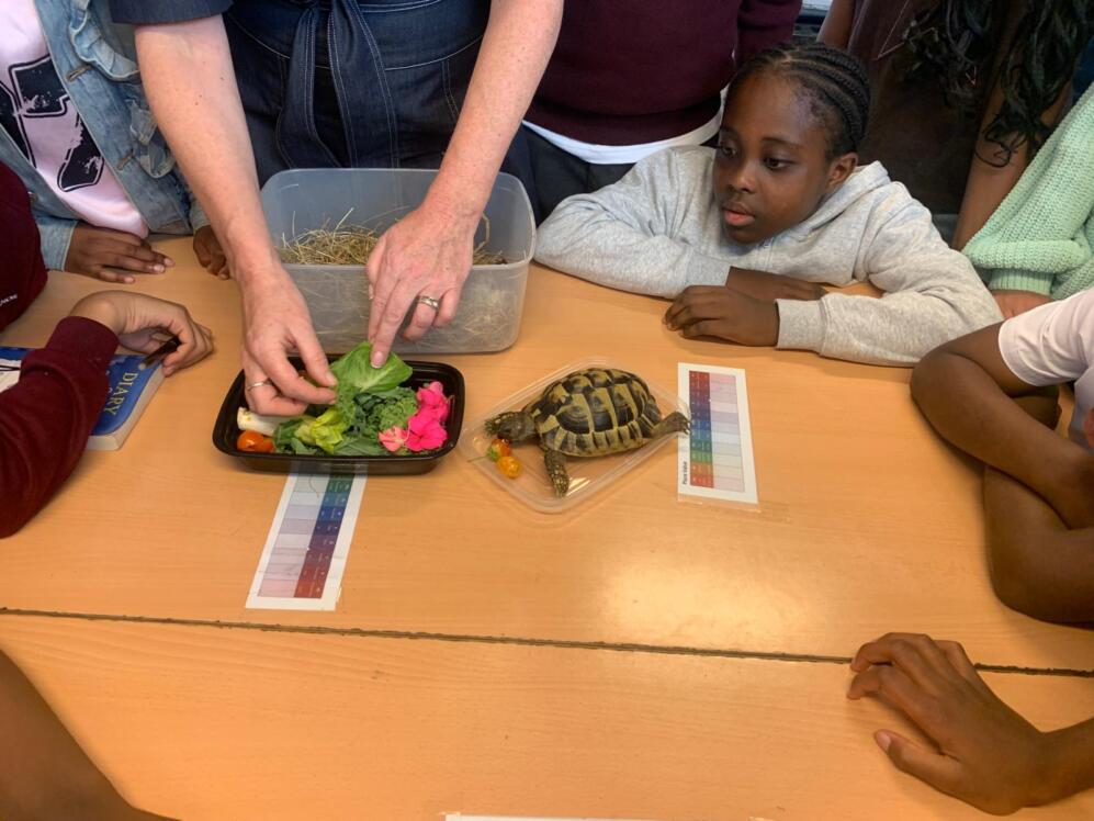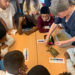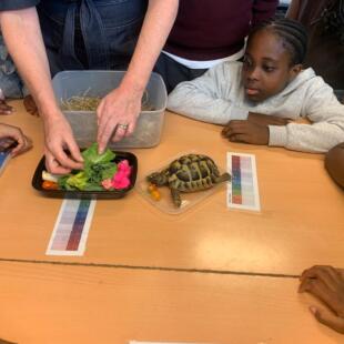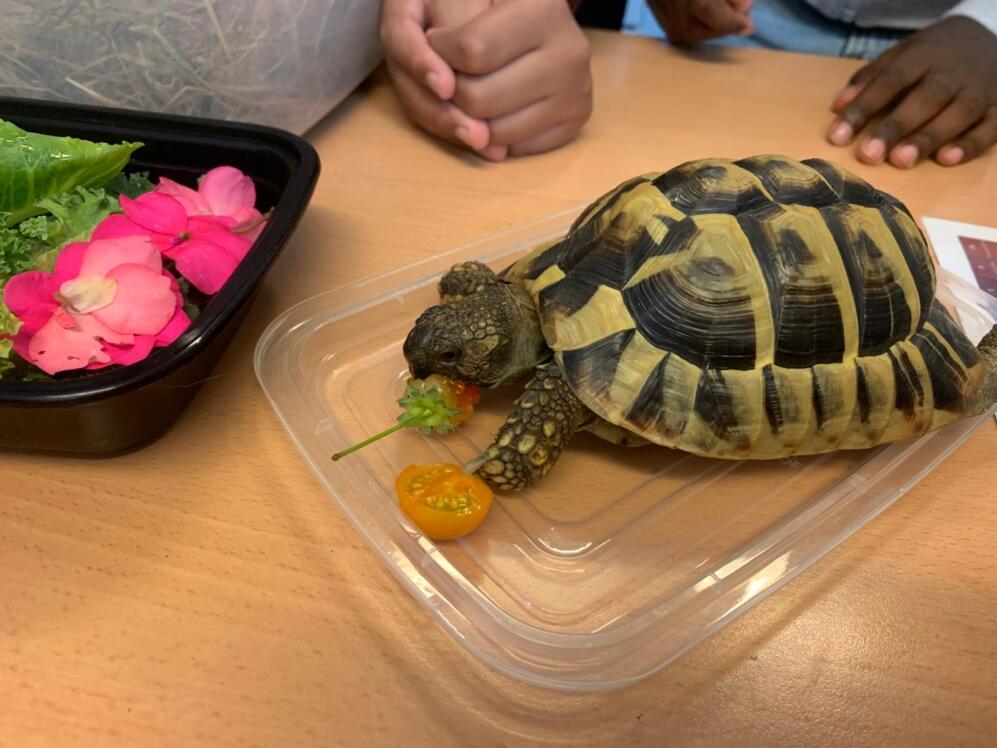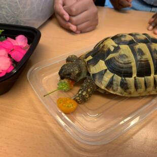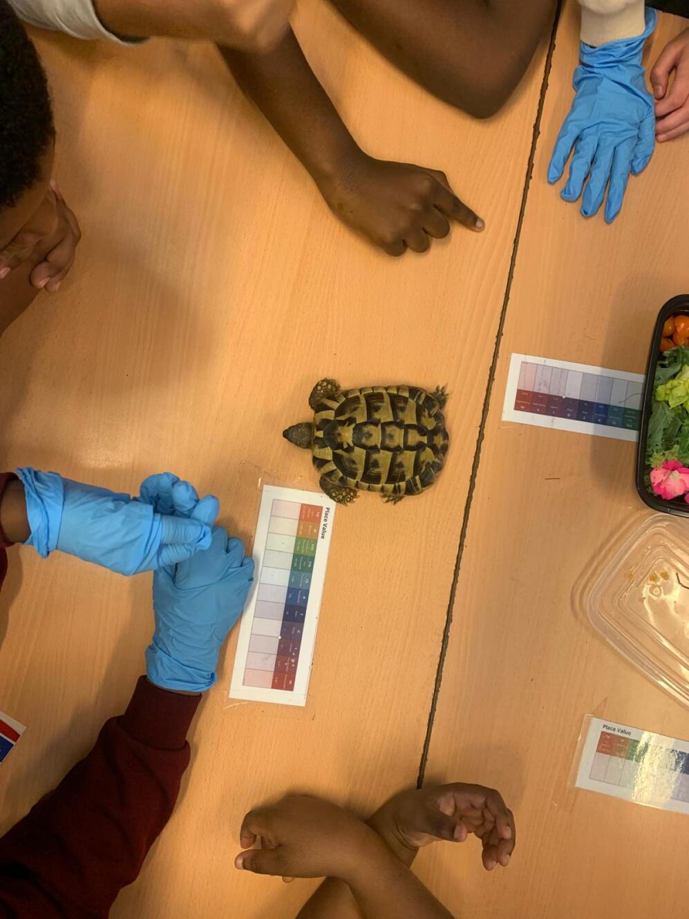 What better way to teach the Year 6 science topic of ‘evolution and adaptation’ than by having Ms Whitfield bring in Boyce, her pet tortoise, so that the children could see first hand how well adapted tortoises are. Did you know that all tortoises are turtles, but not all turtles are tortoises? Staff have known Boyce since Ms Whitfield first got him several years ago and he was just about the size of a satsuma. He’s certainly grown on his diet of fresh leaves and, with a life-span between 80-150 years, will be chomping on fruit and flowers for a long time to come. Children in Year 6 had the chance to feed him some of his favourite snacks (suitably protected in rubber gloves) and he seemed very pleased by all the attention.