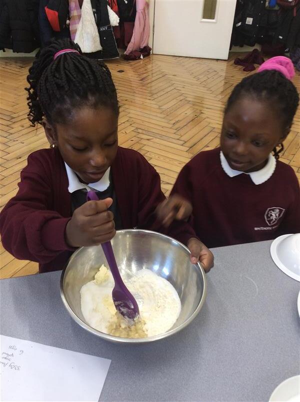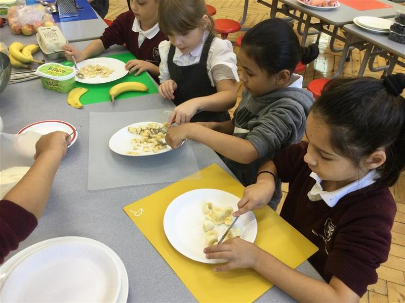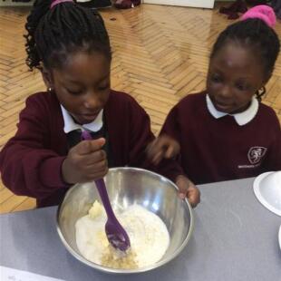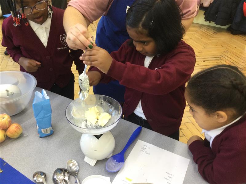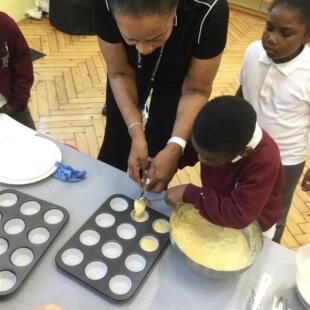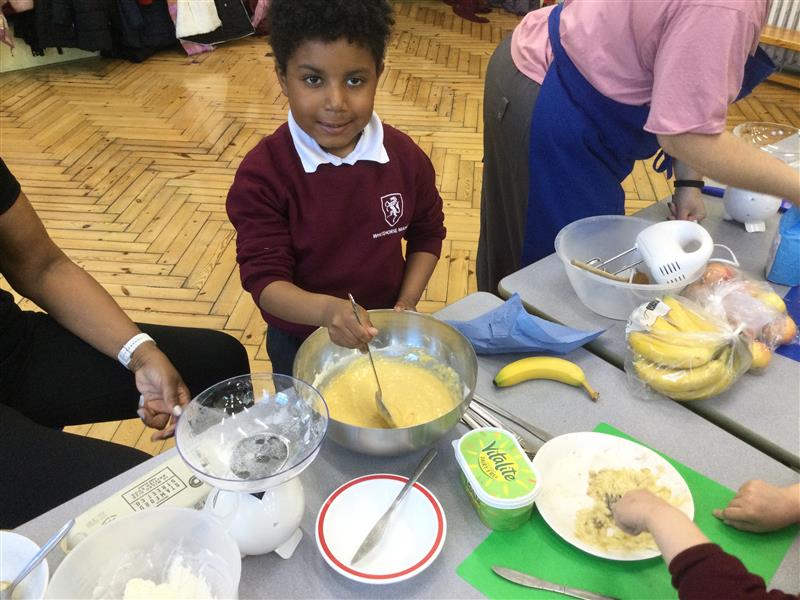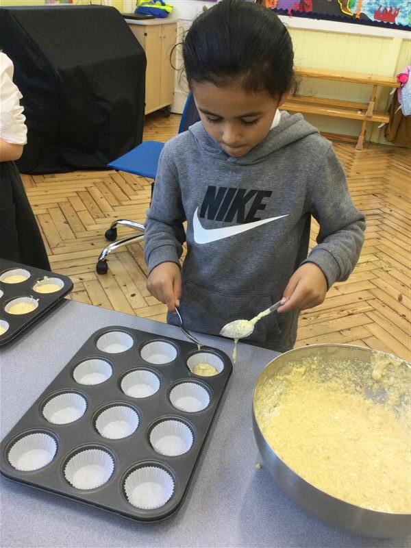 On Thursday morning at Whitehorse, Year 2 assembled in the hall to weigh and measure, tip and pour, peel and chop and stir and scoop. Some of us learned new skills as we made our mixture and scooped in into cake cases ready for baking. In order to make our muffins a more balanced snack, we added fruit or vegetables. Even a fire drill couldn’t hold back our enthusiasm!