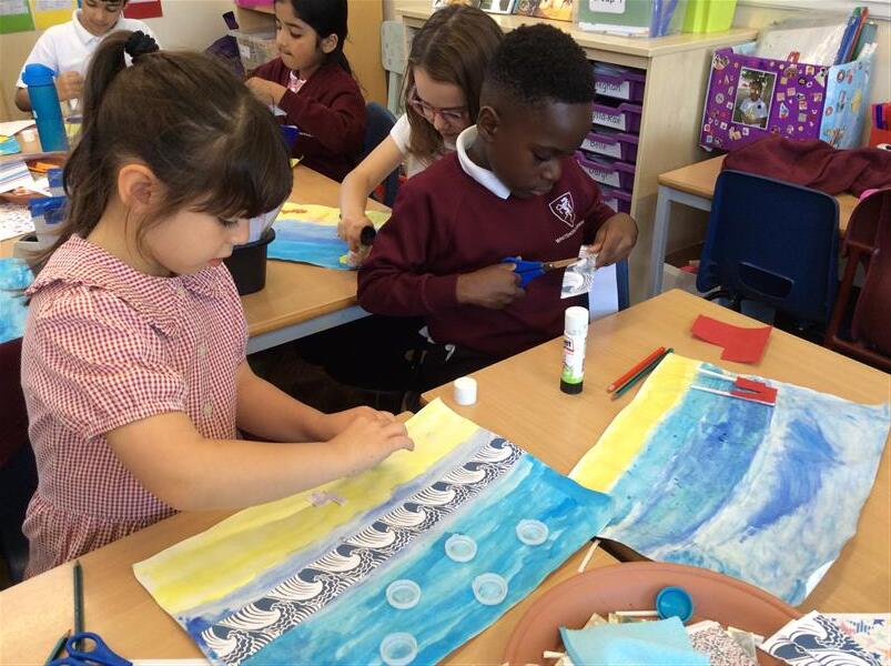 In Year 2 we are underway with our new Thematic topic – Oh I do Like to be Beside the Seaside. We looked at seascape paintings by Turner and Monet, critiquing how each artist used a variety of brush strokes and shades of dark and light to evoke different moods in their painting. Inspired by their work, we experimented with dark and light colours and different brush strokes to create a stormy mood and a peaceful mood. Choosing our preferred mood, we then painted our own seascape background and used mixed media collage material to add detail to our work. You can find our finished artwork in corridors and classrooms at school. Come and take a look!